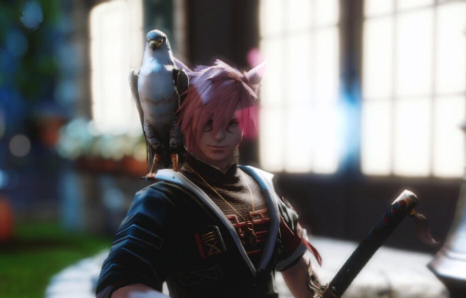 ✧ While traveling Coerthas, he found her nearly frozen to death and nursed her back to health. Now she travels with him and helps him track/hunt game and monsters. She can be a tad bit possessive of him and pecks/bites/claws those she does not like.